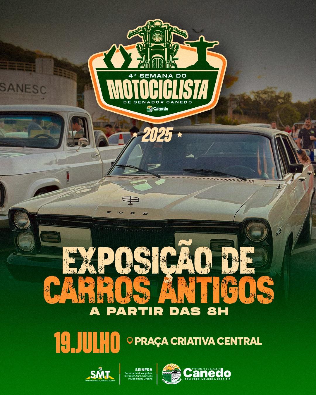 A Prefeitura de Senador Canedo realiza, no dia 19 de julho, a abertura da 4ª Semana do Motociclista com uma programação gratuita na Praça Criativa Central. Um dos destaques do evento é a exposição de carros antigos, que começa a partir das 8h da manhã, com a presença de veículos raros e restaurados, reunidos pela Associação de Proprietários de Carros Antigos.