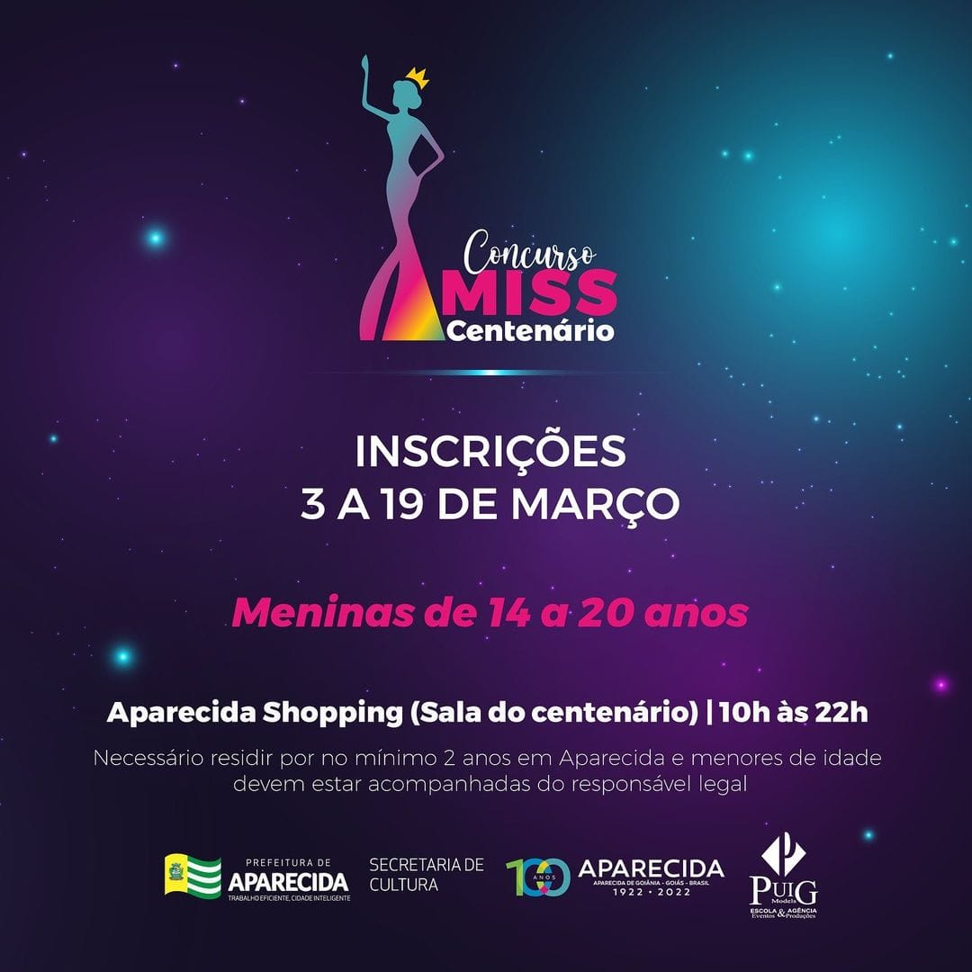 Aparecida de Goiânia vai comemorar seu primeiro centenário em maio deste ano, e a Prefeitura preparou uma programação diversificada para expressar o orgulho da população aparecidense e valorizar a cultura do município. Pensando nisso, a Secretaria de Cultura abriu inscrições para o concurso Miss Centenário, que irá premiar as belezas femininas de Aparecida. As inscrições podem ser realizadas no Espaço Centenário localizado no piso 2 do Aparecida Shopping até 19 de março, das 10h às 22h.