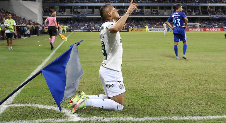 Breno Lopes comemora gol anotado diante do Emelec em vitória do Palmeiras na Libertadores CESAR GRECO/PALMEIRAS (27.04.2022)
