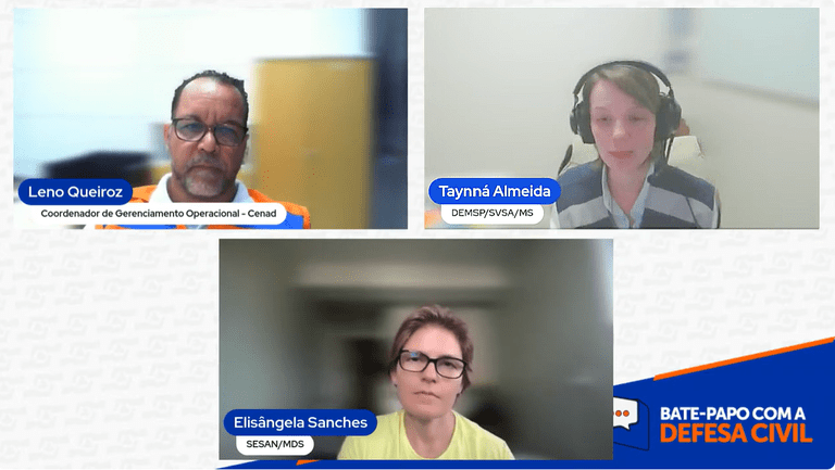 Participaram do bate-papo a coordenadora-geral de Preparação para Emergências em Saúde Pública do Ministério da Saúde (MS), Taynná Almeida, e a coordenadora-geral de Aquisição e Distribuição de Alimentos do Ministério do Desenvolvimento e Assistência Social, Família e Combate à Fome (MDS), Elisângela Sanches.