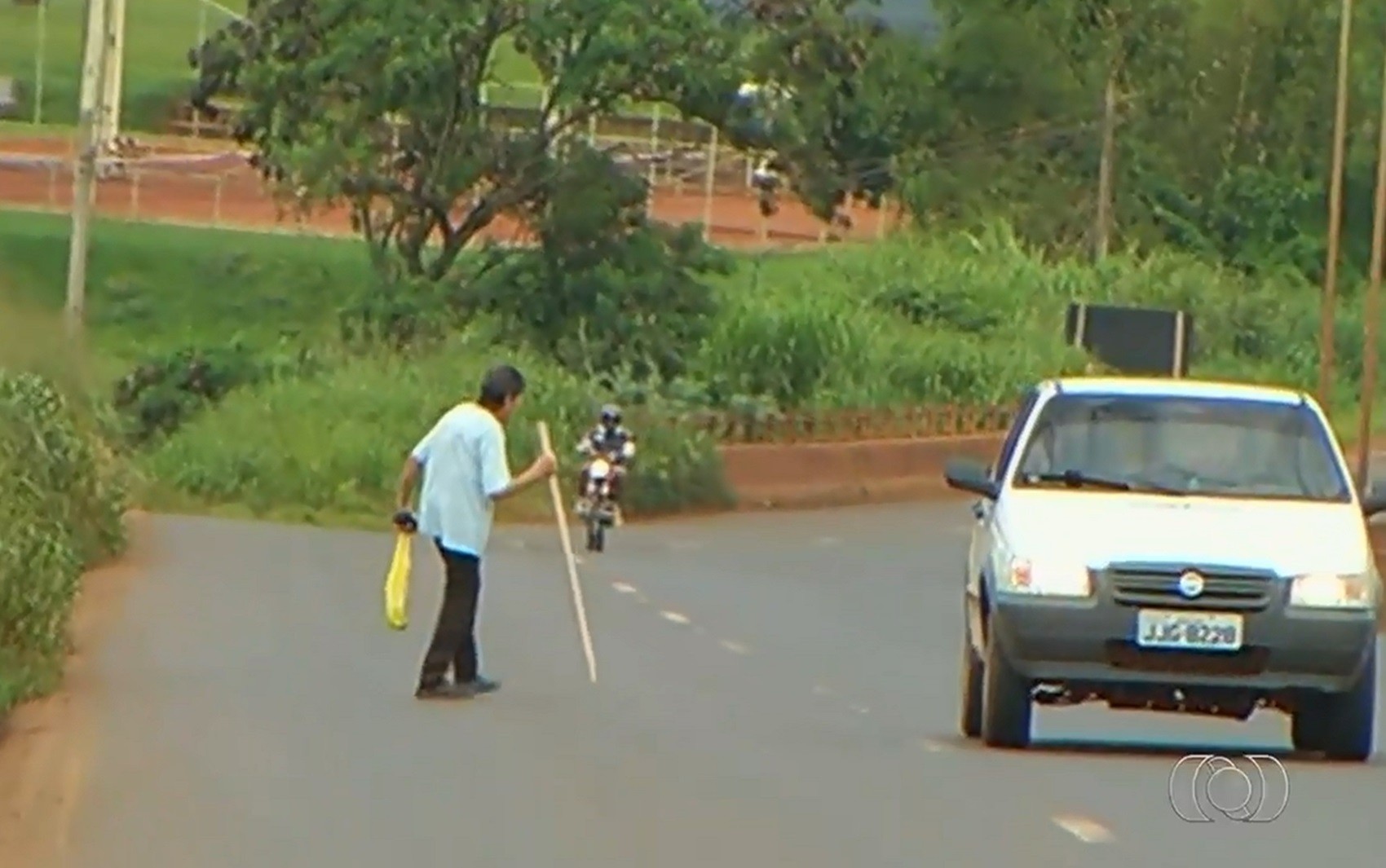 Pedestres se arriscam na BR-060 após passarela ser danificada (Foto: Reprodução/TV Anhanguera)