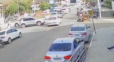 Câmeras de segurança registraram o momento. No vídeo é possível ver que o animal se assusta por algum motivo e começa a pinotear. O cavaleiro tenta controlá-lo, mas acaba caindo no chão.