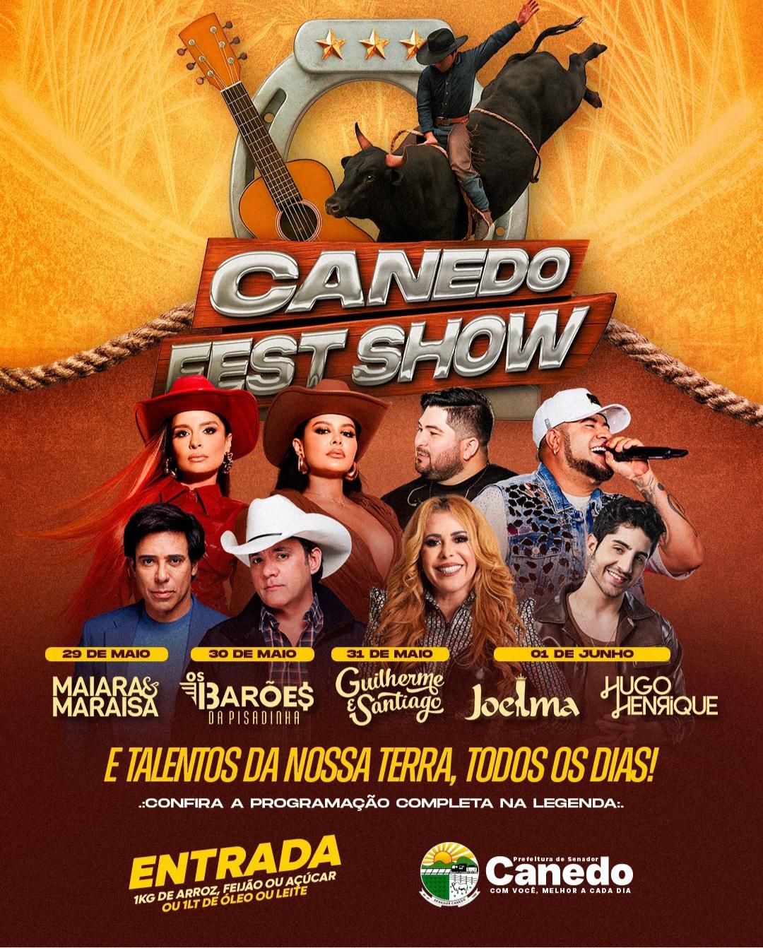 A Prefeitura de Senador Canedo divulgou as atrações do Canedo Fest Show, serão 4 dias de rodeio e shows, sempre a partir das 19h,com atrações nacionais e talentos da nossa terra ,todos os dias.