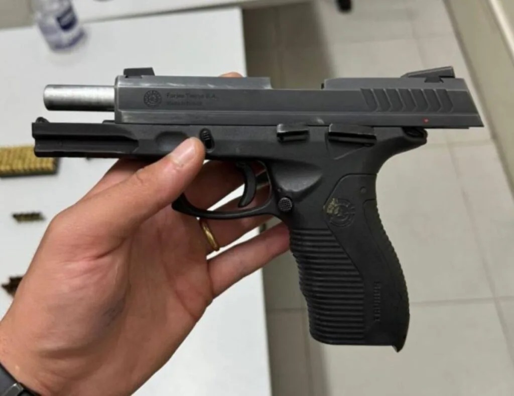 Ao chegar ao local, os policiais localizaram uma pistola calibre .380, carregada com 13 munições. Também foram encontrados cinco estojos deflagrados no quintal e uma caixa de munição lacrada. O suspeito admitiu o uso da arma e apresentou um registro da mesma.