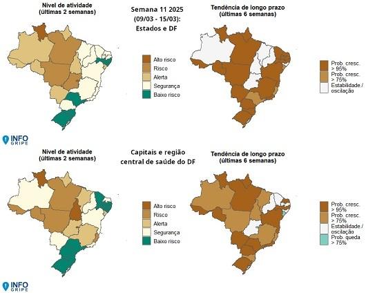 O mais atual Boletim InfoGripe da Fiocruz aponta que 12 das 27 unidades federativas do país apresentaram incidência de Síndrome Respiratória Aguda Grave (SRAG) em nível de alerta, risco ou alto risco, nas últimas duas semanas. Pelo boletim, o aumento de SRAG foi apontado nas regiões Norte e Centro-Oeste, sendo impulsionado em grande parte pelo crescimento de casos entre crianças de até dois anos