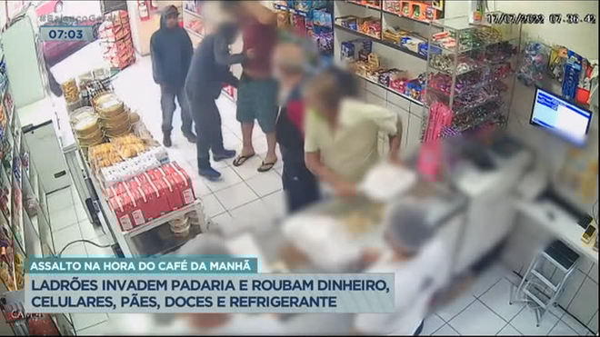 Uma padaria, na Grande São Paulo, foi assaltada por três criminosos no começo do expediente. Os ladrões levaram até um saco de pães, alguns doces e um refrigerante.