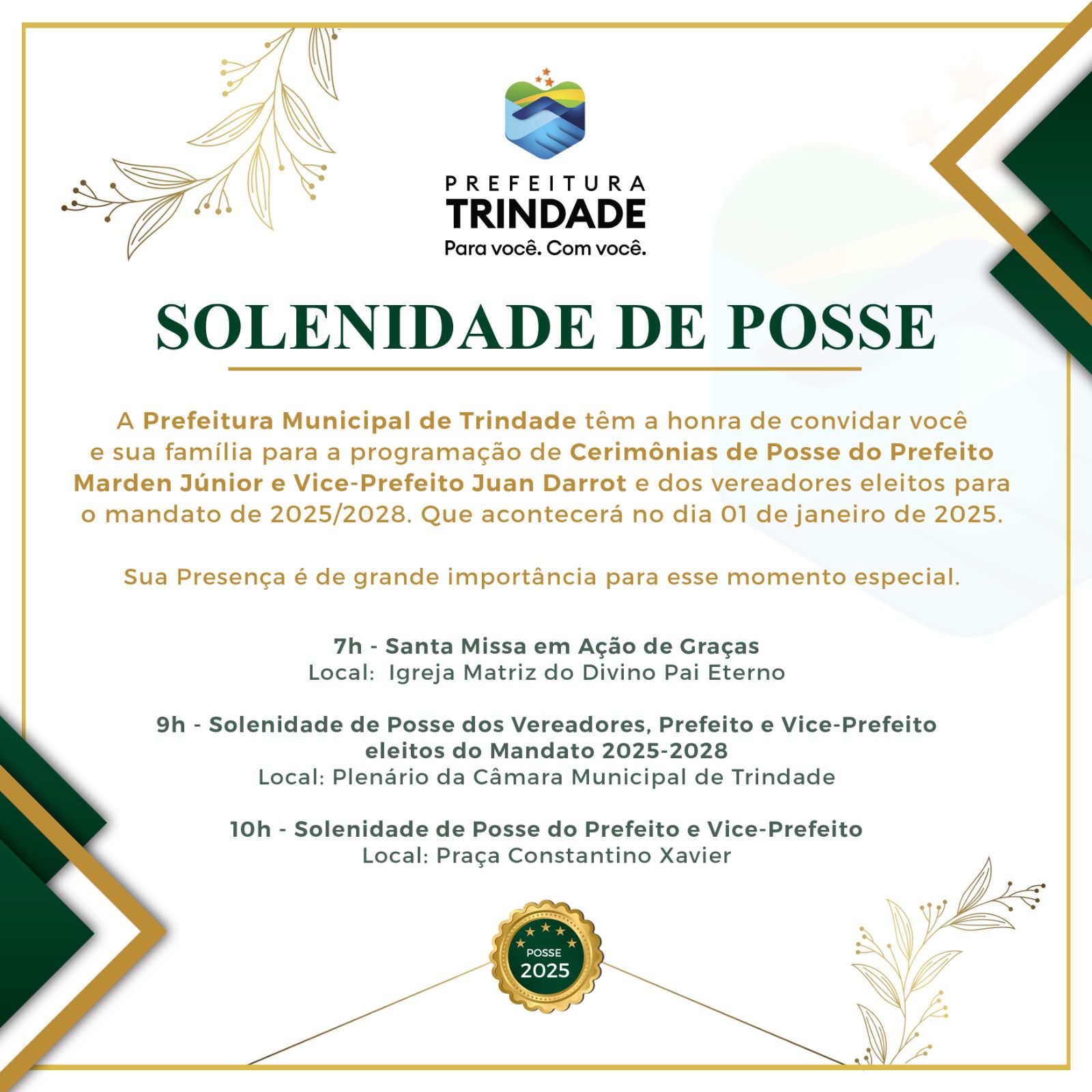 O prefeito reeleito de Trindade, Marden (União Brasil) e o vice Juan Darrot (MDB) tomam posse para o mandato 2025-2028 no dia 1º de janeiro. A programação começa com uma missa em ação de graças às 7h no Santuário Matriz do Divino Pai Eterno, seguida pela posse dos vereadores eleitos às 9h no Plenário da Câmara Municipal. A solenidade principal, com a posse de Marden e Juan Darrot, será às 10h na Praça Constantino Xavier.