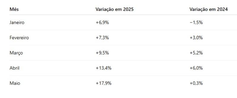 A tendência de crescimento nos embarques nos terminais da região tem se confirmado mês a mês, com altas registradas ao longo de 2025. Ao comparar os meses de janeiro a maio com o mesmo período de 2024, observa-se uma aceleração no movimento de passageiros: