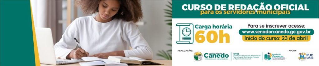 A Prefeitura de Senador Canedo por meio da Secretaria Municipal de Inovação Tecnológica, Gestão de Pessoas e Apoio Institucional (SITEG) e da Escola de Governo Jaime Ferreira, oferece Curso de Redação Oficial com carga horária de 60h, para os Servidores Municipais com início das aulas prevista para dia 23 de abril. O curso é totalmente online e todos os servidores poderão ter acesso.
