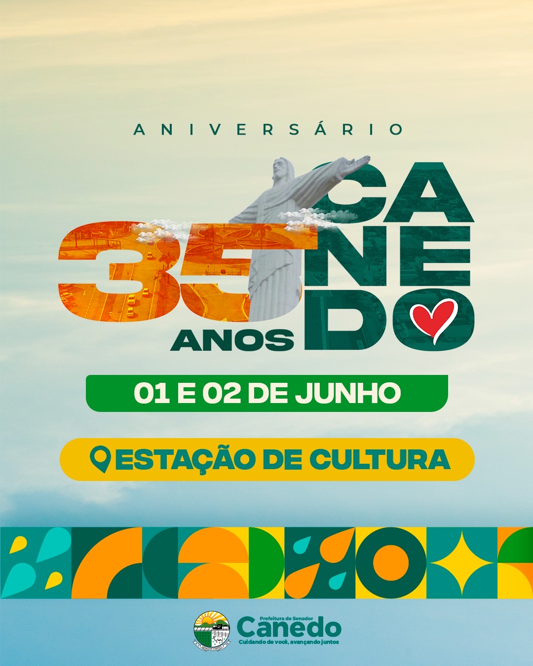 A festa dos 35 anos de Senador Canedo terá início no dia 01 de junho com o tradicional desfile na Av. Dom Emanuel. A partir das 11 horas, teremos a Cavalgada, saindo da concentração ao lado do corpo de Bombeiros, com um grande almoço para os cavaleiros na chegada à Estação de Cultura. À noite, a festa continua a partir das 19 horas na Estação de Cultura com o show da dupla Gino Geno e DJ Cíntia Souza, além de atrações locais. Não perca!