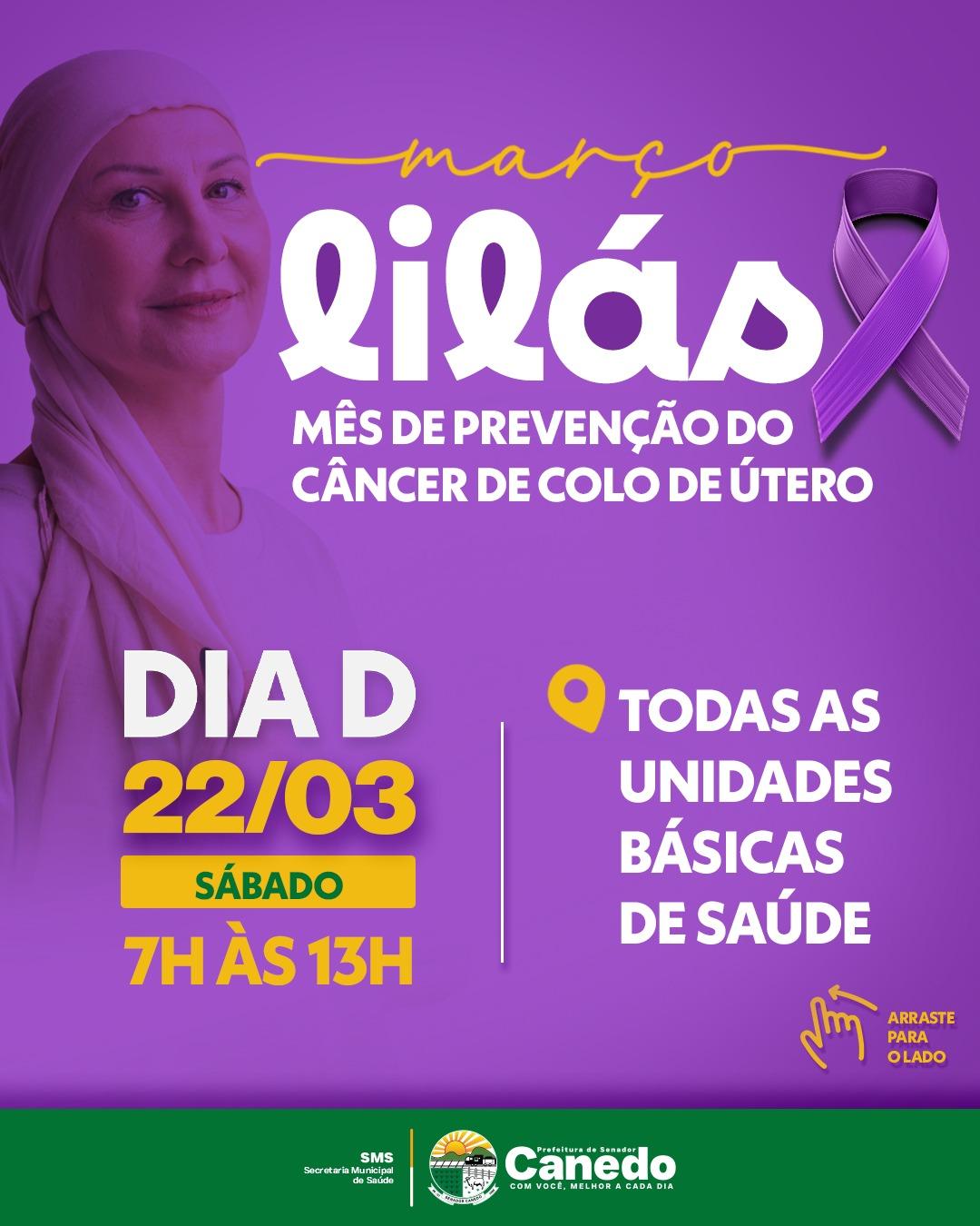 A Prefeitura de Senador Canedo, por meio da Secretaria Municipal de Saúde, realiza neste sábado (22) o Dia D do “Março Lilás”, campanha voltada para a prevenção e combate ao câncer de colo do útero. Todas as unidades básicas de saúde do município estarão abertas das 7h às 13h, oferecendo serviços gratuitos à população.